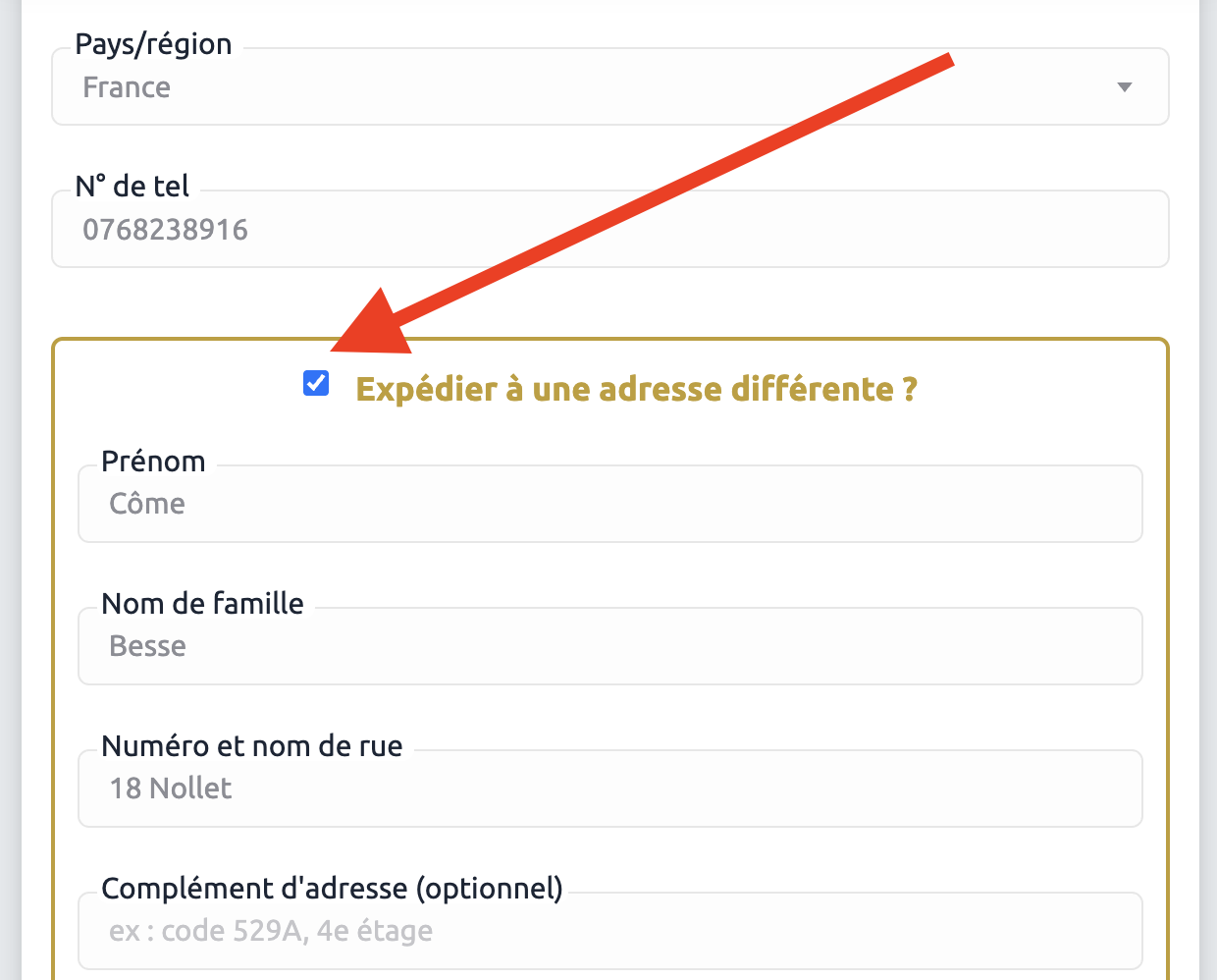 adresse de livraison différente