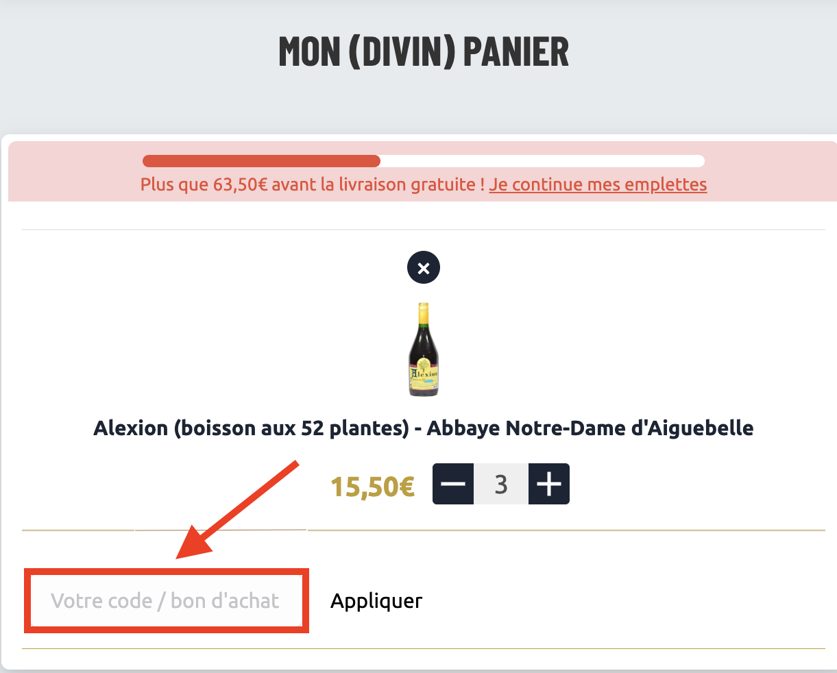 Vous pouvez entrer votre code promo ou bon d'achat dans la case « code promo » à l’étape du panier : https://divinebox.fr/panier/ 😇, pile poil comme indiqué ci-dessous.